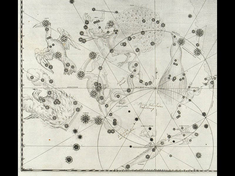 Whereas all of the northern constellations were mythological in origin, Plancius came up with the kinds of constellations that explorers might welcome: Chamaeleon, Phoenix, Apus (Bird of Paradise), Dorado (Swordfish), Hydrus (the Water Snake), Apis (the Bee), Indus (the Indian), Pavo (Peacock), Crux (Southern Cross), Triangulum australe (Southern Triangle), Tucana (Toucan), and Volans (Flying Fish). A cartographical colleague in Amsterdam, Jodocus Hondius, was planning to publish a celestial globe in 1598, and Plancius provided him with the positions and constellation images for the southern stars, which were then printed on the 1598 globe. No copies of that globe survive, but in 1602, a third globe maker, Willem Janszoon Blaeu, produced a copy of the Plancius/Hondius celestial globe of 1598. One of those survives in Greenwich, and we see above (second image) the bottom of the globe, showing the southern constellations. Chamaeleon is visible right in the center, Dorado to the left, and Crux under the haunches of the Centaur at the right, while Pavo, Tucana, and Phoenix are visible below the brass circle. The very next year, Johann Bayer published his star atlas, the Uranometria (1603), the first modern star atlas, and following the 48 plates showing the 48 traditional constellations, Bayer added a 49th engraving, depicting the new Plancius constellations (third image). To see the Southern Cross, you have to look at the plate showing Centaurus (fourth image), where Crux has been added in between the hind feet of the Centaur. This is the first star map, by the way, to show alpha Centauri (the star in the front left foot) by that name, because Bayer was the one who began the practice of labeling stars with letters of the Greek alphabet.