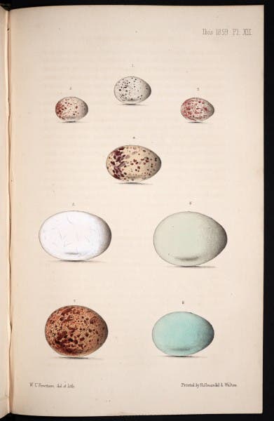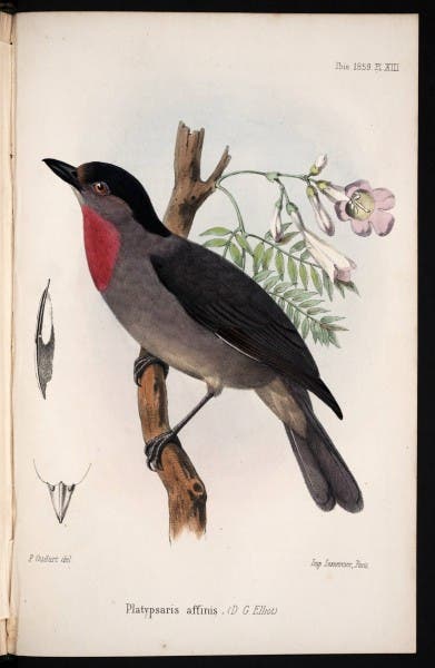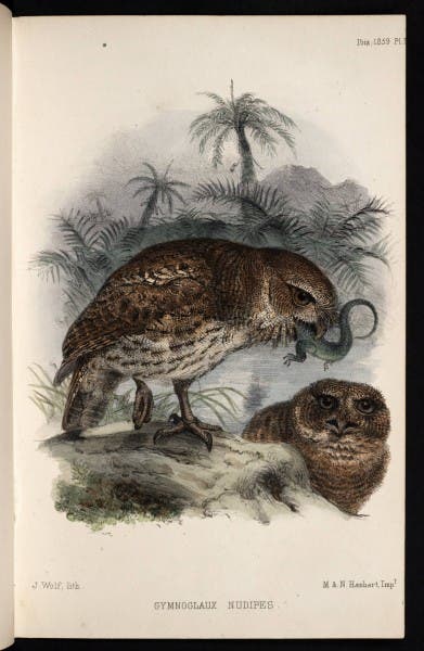 Philip Lutley Sclater, a British ornithologist, was born Nov. 4, 1829. In 1859, Sclater founded the journal Ibis, the first periodical to be devoted exclusively to ornithology. The journal soon distinguished itself, not only by its learned articles (many by Sclater himself), but by the lithographs that appeared in each issue. Sclater commissioned paintings from the very best artists, including Joseph Wolf, who had come to London from Germany and attached himself to the Zoological Society of London, drawing many of their exotic animals, and Paul Louis Oudart, who was a French artist who had travelled around the world on the Uranie before being discovered by Sclater. The images above are all from the first volume of Ibis, and show, in order, a bare-legged screech owl from the Caribbean, drawn by Wolf; a collection of birds eggs from St. Croix, by W.C. Hewitson, and a rose-throated becard, painted by Oudart. The becard is particularly striking in the original, since the hand coloring is so thick that it almost looks like an original painting. The fourth image shows the title-page of the first volume, with the journal’s mascot gracing the woodcut vignette.