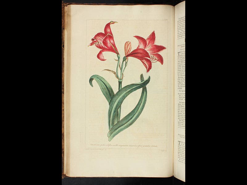 In 1731, Miller issued The Gardeners Dictionary, which would become an essential handbook for gardeners everywhere, going through 8 editions in Miller's lifetime. We have two of those editions in our Collections. Although The Gardeners Dictionary was illustrated, Miller thought that a separate set of engravings to accompany the Dictionary would be nice, and he began issuing Figures of the most beautiful, useful, and uncommon plants described in the Gardeners Dictionary in parts in 1755; the 300 engravings were then published as a two-volume set in 1760. We own this work as well, and it contains beautiful hand-colored engravings made from drawings by the best botanical artists of the era, including the incomparable George Ehret. The first three illustrations above are taken from the Figures, both volumes of which are available online in our Digital Collections.