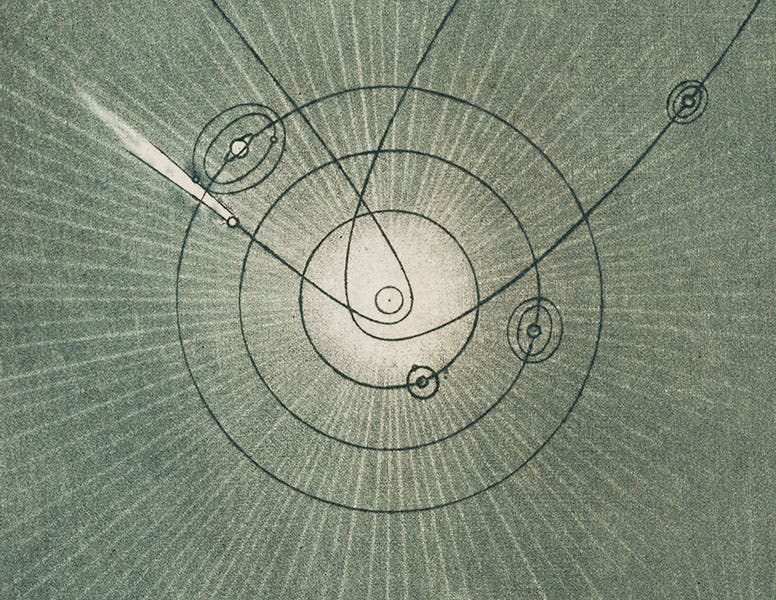 What makes this especially interesting is that, ten years later, Maupertuis published a second edition of his Discours (third image), by which time he was a thorough Newtonian and did not feel it necessary to give Descartes equal time. This edition is twice as long as the first, primarily because Maupertuis added four supplemental chapters in which he laid out all the mathematical proofs that were implicit in the first edition. The other difference between the two editions is evident as soon as you look at the title page, because sitting opposite is a colorful engraved frontispiece that does not appear in the first edition (fourth image). The engraving, titled "Figures des astres", depicts our solar system, with two comets, just below left-center (see detail, first image) and four other stars with their planetary systems. The Sun is round, but the other stars are oblate, in accord with Maupteruis's conclusion that rapidly rotating stars would flatten out. The fifth image shows a detail of the stellar system with its flattened star at upper left, along with part of the title cartouche.