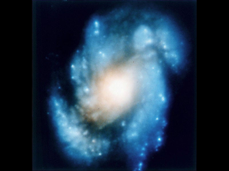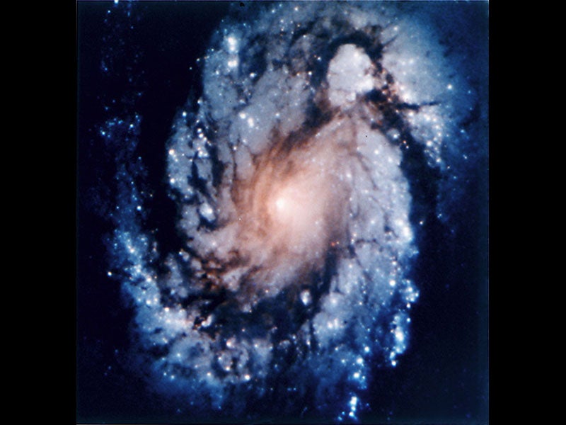 Méchain discovered the galaxy M100 on Mar. 15, 1781, and there is an interesting modern footnote relating to M100. When the Hubble Space Telescope (HST) was first launched in 1990, it recorded an image of M100, and this image was very blurry, one of the first signs that something was seriously wrong with the HST. Three years later, after the HST was repaired with some imaginative optical corrections put in place by a shuttle mission, the HST took another image of M100, and this time the gorgeous spiral was in perfect focus. The "before and after" series of M100 (fourth and fifth images) was frequently reproduced to demonstrate to Congress that their billions of dollars had not been wasted (and that the Space Shuttle was worth their investment as well).
