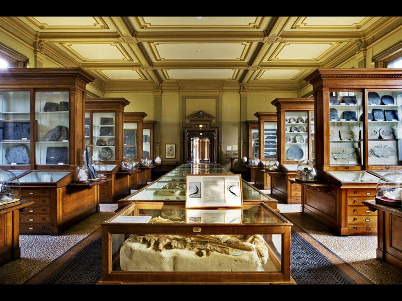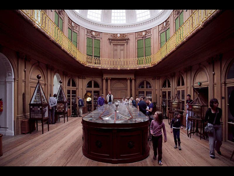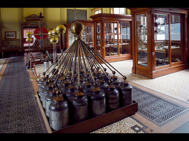 Pieter Teyler van der Hulst, a wealthy Dutch merchant, was born Mar. 25, 1702. When Teyler died in 1778, he left the bulk of his estate to his home city of Haarlem, to be used for the pursuit of religion, science, and the arts. The funds were used to found Teyler's Museum in Haarlem, the oldest museum in the Netherlands; the Museum itself occupied the former Teyler house. Behind the house, a building was added in 1784, called the "Oval Rom," with a long display case in the center for minerals and fossils, and an incongruously large electrostatic generator at the end of the case. The electrical machine was built by Martinus van Marum, the first curator of the museum, and he used to give weekly electrical demonstrations, drawing huge sparks from his giant spinning wheel. We see above a view of the Oval Room in 1800 (first image), and then a modern view (second image). One will note that the electrical machine has been moved out, and you will now find it in a different room (third image) along with a variety of other electrical experimental equipment, such as a marvelous set of Leyden jars (fourth image). The Museum houses a splendid fossil room as well (fifth image), which contains, among other treasures, Johann Scheuchzer’s famous giant salamander, which he thought was human, a witness to the great Flood.