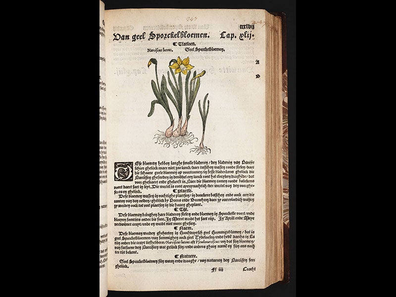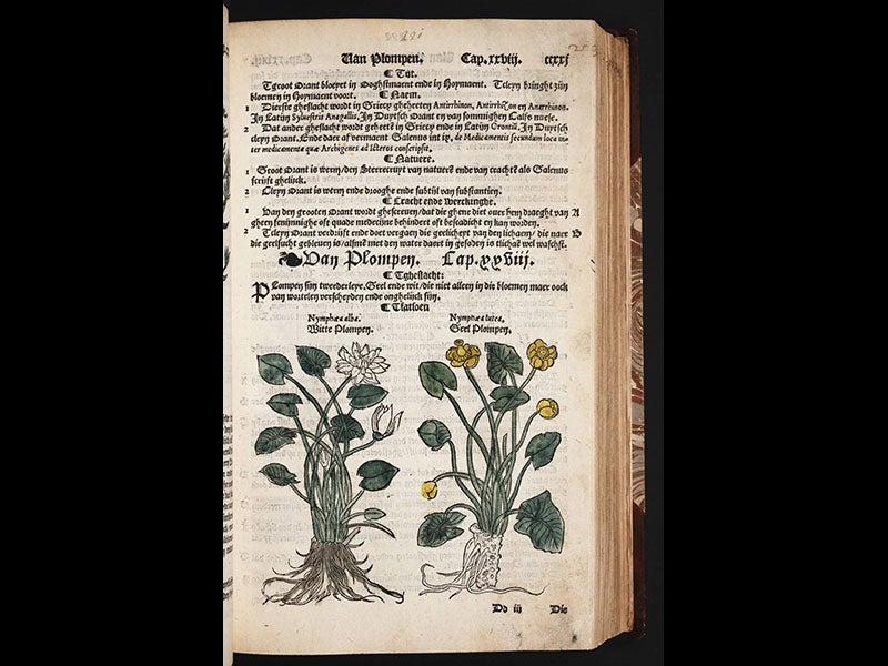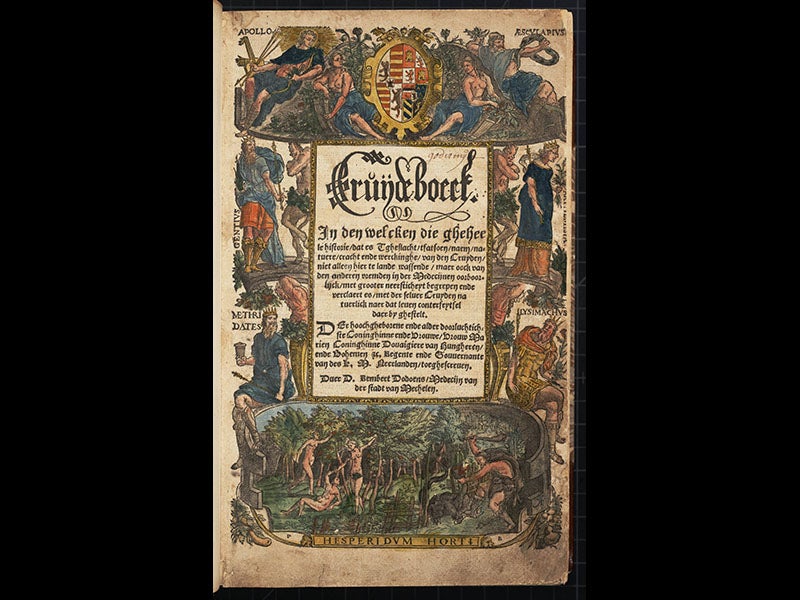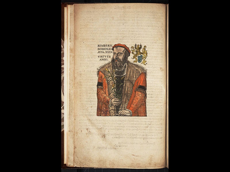 Rembert Dodoens, a Flemish physician and botanist, was born June 29, 1517. Dodoens was the first of many great Netherlandish herbalists. His first herbal, Cruydeboeck (1554), was largely derived from the herbal of Leonhart Fuchs, but later compilations began to include plants gathered in his many travels. In 1574, he became physician to the Holy Roman Emperor in Vienna, and it was there that he got the first Western glimpse of the Codex Juliana, a gorgeous manuscript edition of the herbal of Dioscorides, made for the imperial princess Juliana in Constantinople in 512 AD, and one of the oldest surviving scientific manuscripts of any kind. Some of Dodoens' later herbals contain illustrations copied from this landmark manuscript. The images above are all taken from his Cruydeboeck and show, in addition to a portrait of Dodoens and the woodcut title page, a bur-reed (first image), two water lilies (third image), and a narcissus (fourth image). In 1964, Linda Hall Library organized its second exhibition, which it did in concert with the Clendening Library at the University of Kansas Medical Center and the Spencer Library at KU in Lawrence. The exhibition was called One Hundred Herbals; it was designed to show that, among the three libraries, a scholar could find nearly all of the important herbals from the first two centuries of printing. For that exhibition, Linda Hall Library supplied two editions of Dodoens Cruydeboeck (1554 and 1608), the Clendening provided the first English translation of Dodoens, A New Herball, or Historie of Plants (1595), and Spencer Library exhibited a Latin version, the Stirpium historiae (1616). That exhibition brochure, long out of print, has just recently been made available online; the various Dodoens editions are listed on page 5. Dr. William B. Ashworth, Jr., Consultant for the History of Science, Linda Hall Library and Associate Professor, Department of History, University of Missouri-Kansas City. Comments or corrections are welcome; please direct to ashworthw@umkc.edu.