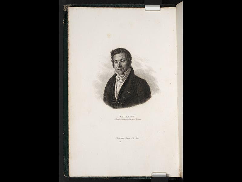 René Lesson, a French naval officer, surgeon, and zoologist, died Apr. 28, 1849, at age 55. Lesson was the assistant surgeon on the voyage of La Coquille from 1822 to 1825, which meant, in the tradition of the French navy, that he was also the de facto on-board naturalist. The Coquille was being sent around the world, under the command of Louis Isidore Duperrey, with a mission to visit those places that had escaped the attention of the previous French circumnavigation, that of the Uranie (1817-20). The voyage of the Coquille lasted 3 years, 1822-25, and since the crew remained remarkably healthy for such a long cruise (no one died of scurvy, which was highly unusual—in fact, no one died of anything, which was truly remarkable), and so Lesson was able to wear his naturalist hat most of the time, which he did with great enthusiasm. He collected and drew hundreds of mammal, bird, fish, and invertebrate specimens from island groups scattered through Polynesia and Melanesia, as well as from New Guinea and Australia.