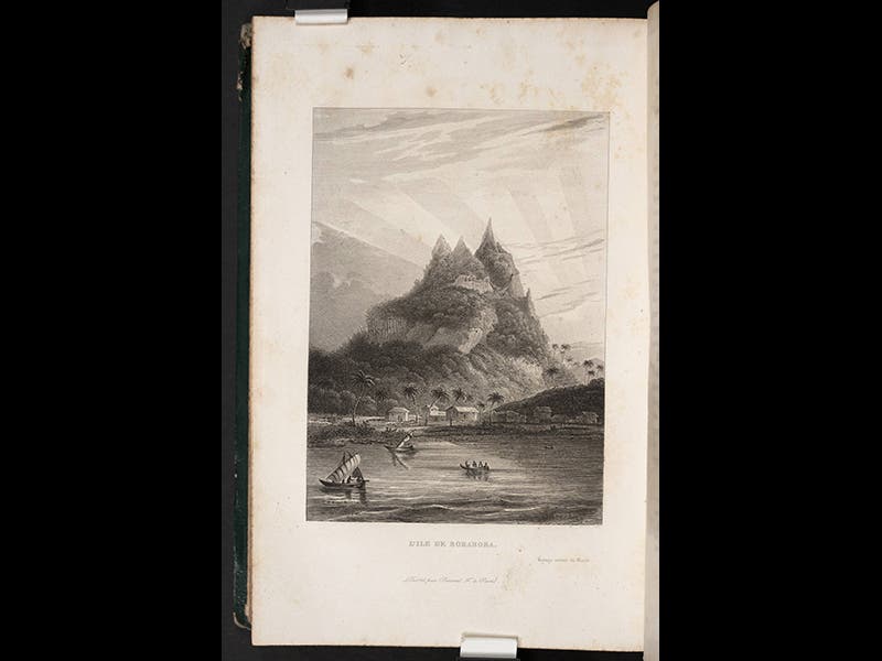 The official narrative of the expedition, Voyage autour du monde, was published by Duperrey with remarkable speed, the first volume emerging in 1825, the same year the Coquille returned, and the last in 1830. Lesson was responsible for the zoology volumes, and we have the complete set in the Library. In 1839, Lesson published his own two-volume book on the voyage, with an identical title: Voyage autour du monde, containing many of his drawings that were not included in the official narrative. Our images today are taken from this second publication of 1839, and include, in order: a wombat, a bird of paradise, a kiwi (with enlarged beak and foot), a view of Borabora, and a portrait of Lesson, which served as a frontispiece to volume 1.