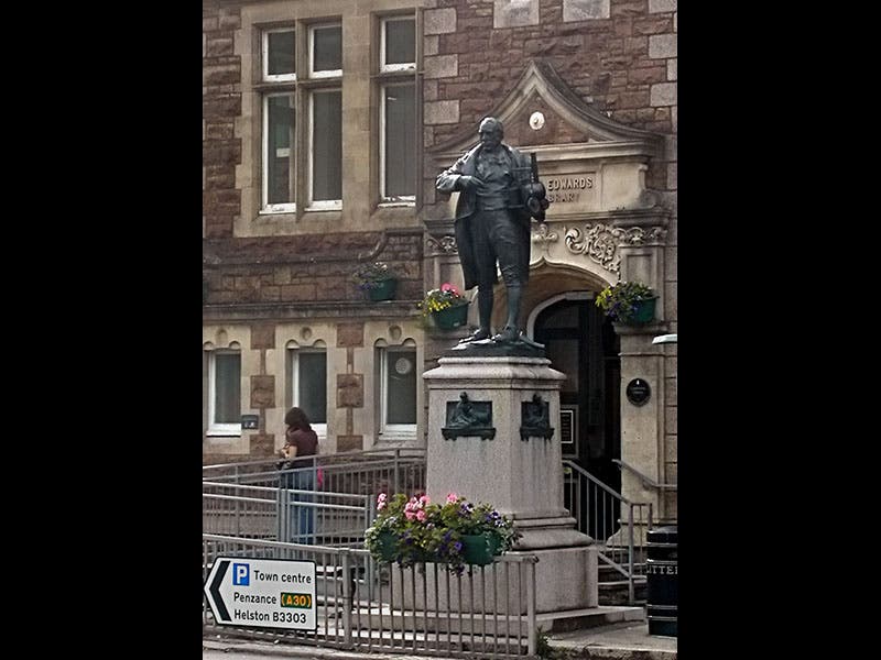 There is a portrait of Trevithick, by John Linnell, somewhere in the National Museum of Science and Industry complex in Britain (fourth image). And should you ever be in Camborne, down near the tip of Cornwall, and strolling past the Camborne Public Library, you will see a handsome statue of Trevithick standing before you. He holds a replica of one of his locomotives (fifth image).