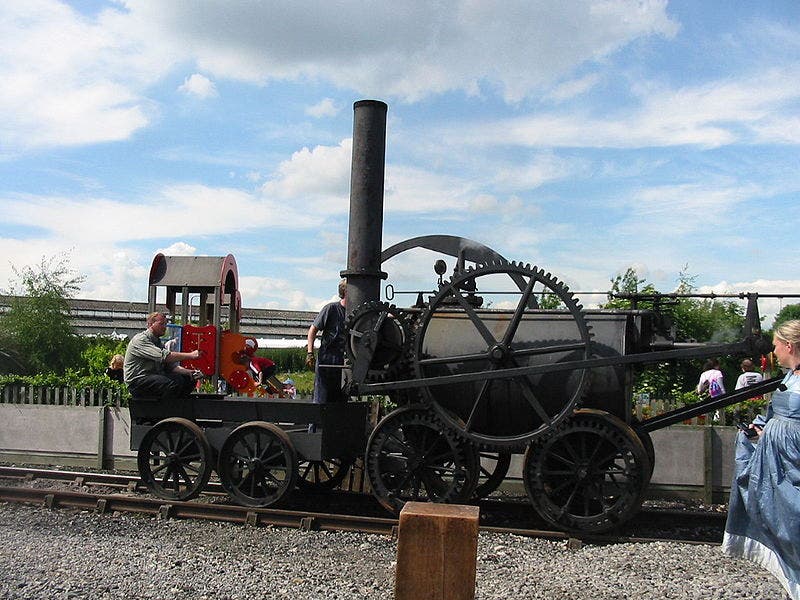Richard Trevithick, a Cornish engineer and inventor, was born Apr. 13, 1771. In the late 18th century, the only steam engines available in England were the Newcomen engine and the Watt-Boulton engine. Both were atmospheric engines, which means they used low-pressure steam to push a piston in one direction and atmosphere pressure to return the piston to its starting position. Such engines were great for pumping water out of mines, but they were too heavy and too slow for use on a locomotive. Trevithick invented a high-pressure, two-stroke steam engine small enough to put on wheels, and he used it to build a steam locomotive. Actually, he built several of them. The first, called Puffing Devil, was constructed in his home town of Camborne in Cornwall; it was a road locomotive, rather than a railway engine, which he used to carry some passengers up Camborne hill in 1801. Then he built another, usually called the Coalbrookdale engine, for an ironworks in Shropshire; this was the first railway engine. Finally, in 1804, he used a third locomotive (called the Penydarren) to pull a load of 10 tons on a railway line of 10 miles in Swansea, in order to win a bet, which he accomplished on Feb. 21, 1804.