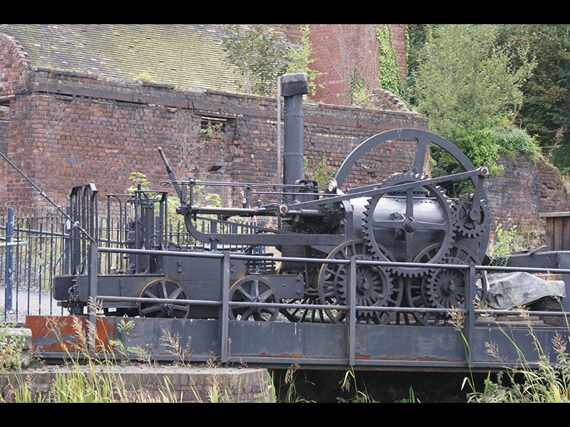 Oddly, the only tangible remains of these three famous locomotives is a single drawing of the Coalbrookdale locomotive, in the archives of the British Museum. We see above a later engraving based on that drawing (first image). It had a large flywheel (which you would need if you are trying to produce rotary motion with just one piston); note also that the power wheels were driven by two spur gears. This has been all the detail necessary to prompt the building of a number of modern replicas of Trevithick locomotives; there is a replica of the Coalbrookdale locomotive at the Blists Hill Museum in Ironbridge (second image), and one of the Penydarren at the National Waterfront Museum in Swansea (third image). If they look similar, remember that both are based on the same drawing. If you would like to see one of the replicas in action, here is the Blists Hill Museum replica with its steam up.