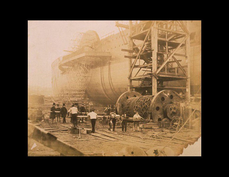 But it was in 1857 that Howlett, now working on his own, got the chance to show the real potential of photography, with a commission to photograph the completion of the building of the Great Eastern, the monstrous ship that would one day help lay the transatlantic cable. His documentary photographs of the ship construction, such as the first image above, are spectacular, but it was a photograph he took of the chief engineer, Isambard Kingdom Brunel, that established his legacy (third image). There had never been a portrait like this, one that showed the subject in his element, here framed by those wonderful over-sized launching chains, and capturing Brunel's determination, grit, and independence, everything about him, right down to the mud on his boots and trousers. When we featured Brunel as Scientist of the Day several years ago, we led off with this portrait; indeed, it is impossible to talk about Brunel without showing it. Many historians of technology consider this to be the single most powerful portrait in the history of their discipline, and who can argue with that assessment.