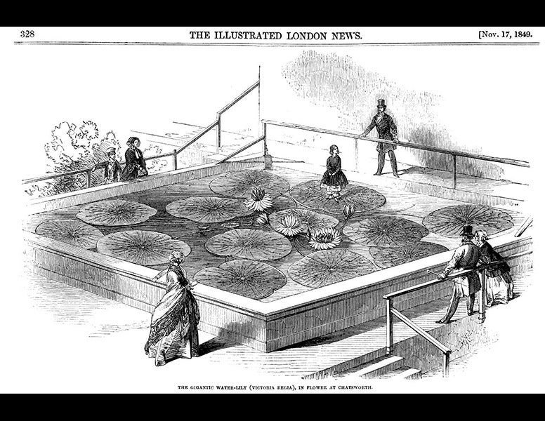 But what really made Schomburgk famous in England was his discovery of an exotic plant: the giant Amazon water lily, Victoria regia (now Victoria amazonica; first and second images). Actually, Schomburgk was far from the first European to observe and describe the plant, but when he sent back an account and seeds in 1837 to the Royal Gardens at Kew, he struck some kind of a chord with the public, perhaps because the lily was huge and otherworldly, perhaps because it was named for the young, newly-enthroned queen. Kew Gardens tried to get one to flower for a decade, but that honor went to the Duke of Devonshire , who built a special Amazonian-lily hothouse at Chatsworth and whose gardeners coaxed one into bloom in 1849 (third image). Two years before, Curtis's Botanical Magazine had published a special issue on the Victoria regia, using illustrations supplied by Schomburgk (first and second images).