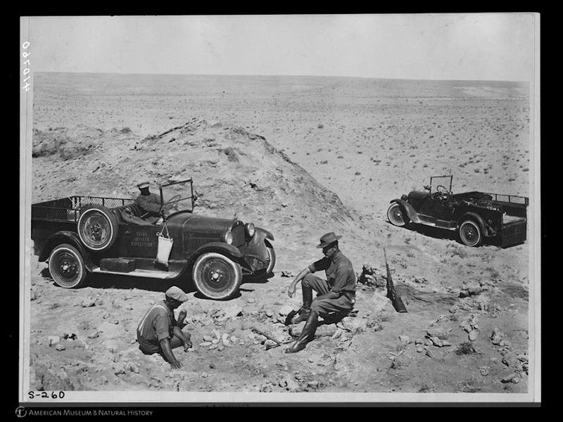 The photos above, three of them from the AMNH archives, depict: Andrews, two vehicles, and a nest of eggs (first image); Andrews driving a Dodge and leading two Fultons (second image); a caravan of gasoline-laden camels (third image); Andrews holding several dinosaur eggs (fourth image); and a Protoceratops skull in situ (fifth image). The last two images were displayed in our Paper Dinosaurs exhibition in 1996.