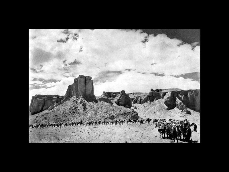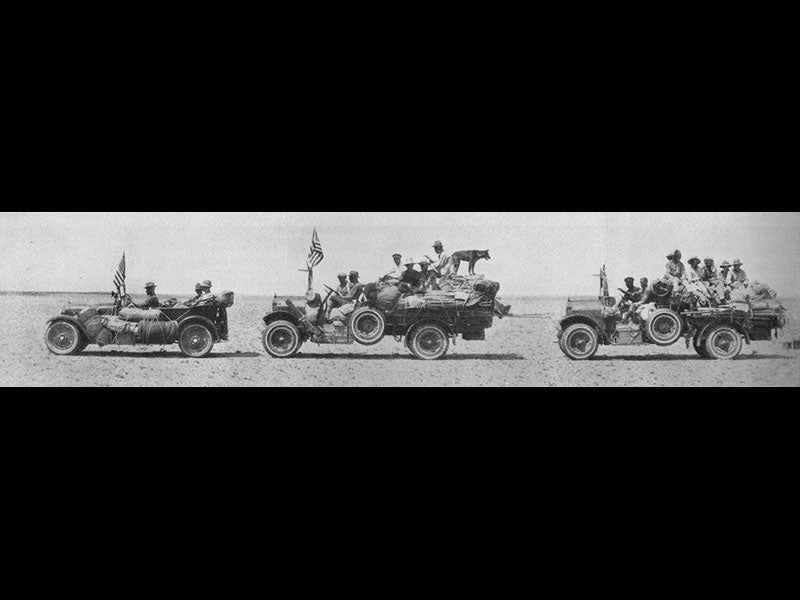One of the more intriguing features of the Central Asiatic Expeditions was their reliance on motorized transport. It took considerable moxie to even consider using motor vehicles in such a desolate and isolated area, where factory reps would be few and far between, as would filling stations and body shops. But Andrews was convinced that the advantages were great and the liabilities could be overcome, and so he carefully screened a number of candidates, finally selecting five Dodge Brothers touring cars and two Fulton trucks. The fuel and spare parts were carried by a caravan of 75 camels that was sent out ahead of the cars. On the first two expeditions of 1922 and 1923, they travelled over 10,000 miles, and the Dodges handled everything that the desert threw at them. And the Fulton trucks carried back a tidy collection of precious fossils, bound for the Museum in New York.