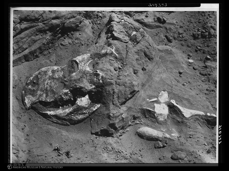 The photos above, three of them from the AMNH archives, depict: Andrews, two vehicles, and a nest of eggs (first image); Andrews driving a Dodge and leading two Fultons (second image); a caravan of gasoline-laden camels (third image); Andrews holding several dinosaur eggs (fourth image); and a Protoceratops skull in situ (fifth image). The last two images were displayed in our Paper Dinosaurs exhibition in 1996.