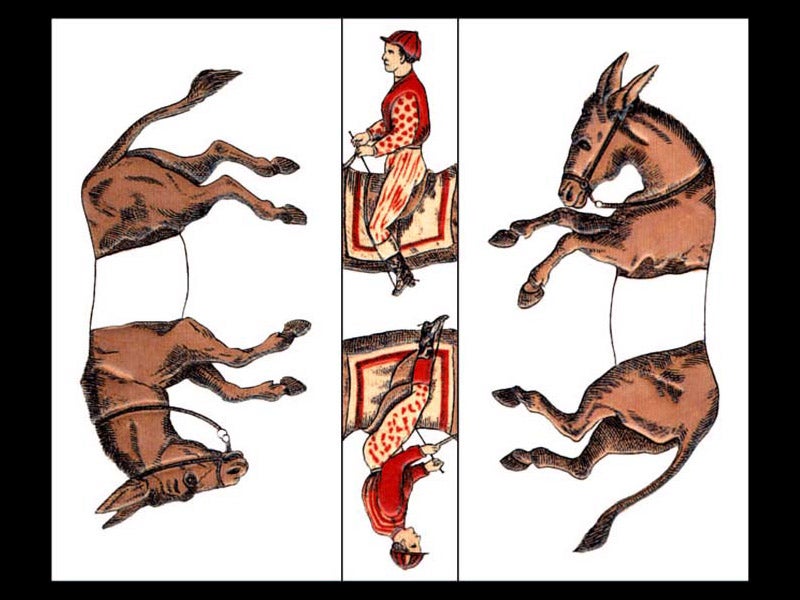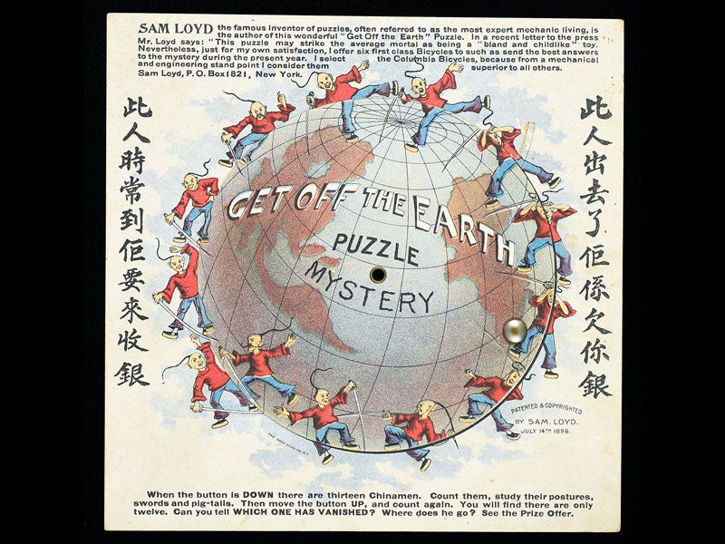 Sam Loyd, an American puzzle and mathematical games designer, was born Jan. 30 (or Jan. 31), 1841. Loyd was trained as a mechanical engineer, but he discovered early on that he had quite a knack for creating chess problems, of the variety "white to play and mate in three", except that Loyd's were more clever and far more fiendish, such as: "From a standard opening position, show how, if both players make the same moves, white can mate in four.” Loyd found that people would pay for his puzzles, and he never looked back. By 1870, he had moved on from chess problems to mathematical and mechanical puzzles. One of his most popular and successful puzzles came out in 1871 and was called "Trick Donkeys." You bought a little printed card that you cut into three strips, two with a donkey printed on them, and one with two jockeys (first image). The goal was to mount the two riders on the two donkeys without bending or cutting the strips. We reproduce the puzzle above, which you can print out and cut apart, if you like. If you haven’t seen this before, good luck! The puzzle sold literally hundreds of millions of copies over Loyd's lifetime. His other ingenious creation was called "Get off the Earth" (1896), a circular disk rotating on another larger circular disk, on the overlap of which are printed 13 Chinese warriors (second image). When you rotate the outer disk as instructed, one of the warriors disappears. Where does he go?