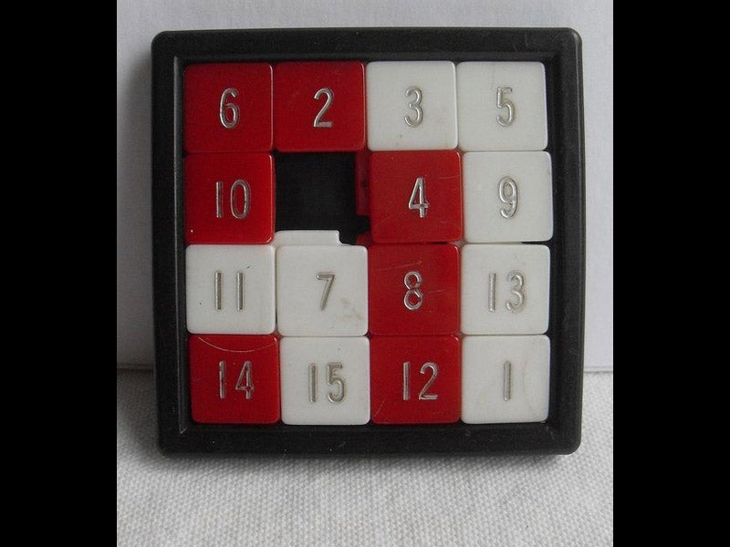 Loyd also claimed to have invented the "15 puzzle", or the “14-15 puzzle”, which was probably the most popular puzzle in the world in the 1880s. You have probably played with one, a shallow 4x4 square box with 15 tiles inside that slide around, each containing a number between 1 and 15, and with one square empty (third image). The goal is to manipulate the numbered tiles into a sequence from 1 to 15, with the empty square at bottom right. Loyd sold the puzzle with the tiles in order, except that 14 and 15 were interchanged. If that is the case, then the puzzle cannot be solved. If the tiles are inserted at random, then the puzzle can be solved half of the time. Many books on puzzle history call the “15 puzzle” Loyd's greatest invention, but we now know he didn't invent it at all--he merely claimed ownership 15 years after someone else invented it. There was more than a little of the unscrupulous huckster in Sam Loyd.