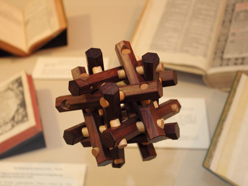 On Loyd's birthday in 2015, the Library opened an exhibition: Ingenious Objects: Geometric Puzzles by Stewart Coffiin. Coffin made intricate puzzles from exotic woods, usually in the form of interlocking polygons; the trick was to find the key that allowed them to be taken apart. The collection we exhibited was that of a retired professor of mathematics in Kansas City, Norton Starr. Here is one of Coffin’s handiworks, the Jupiter puzzle (fourth image). The Library’s display cases showed both assembled puzzles and duplicates that have been taken apart so the design and workmanship could be appreciated (fifth image).