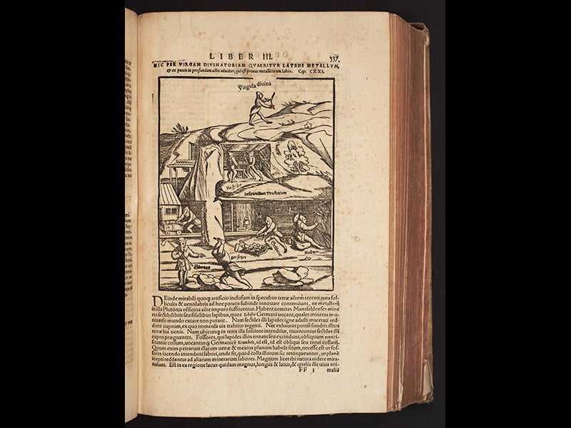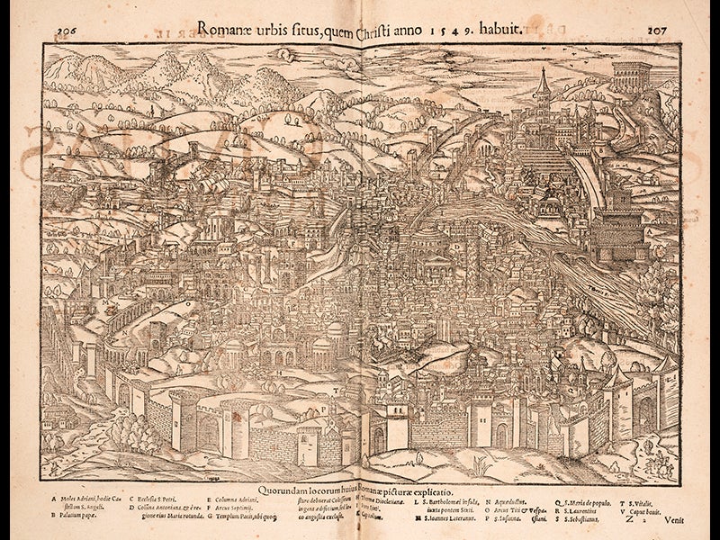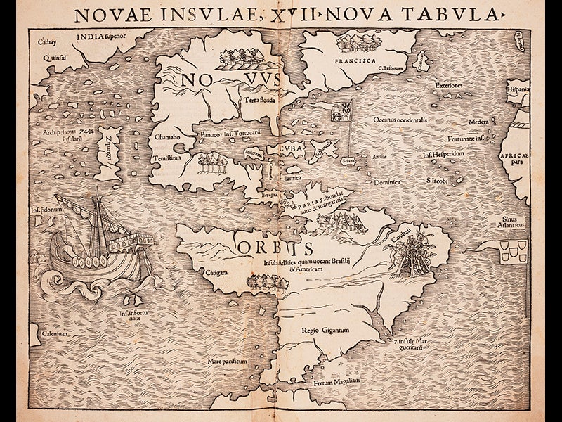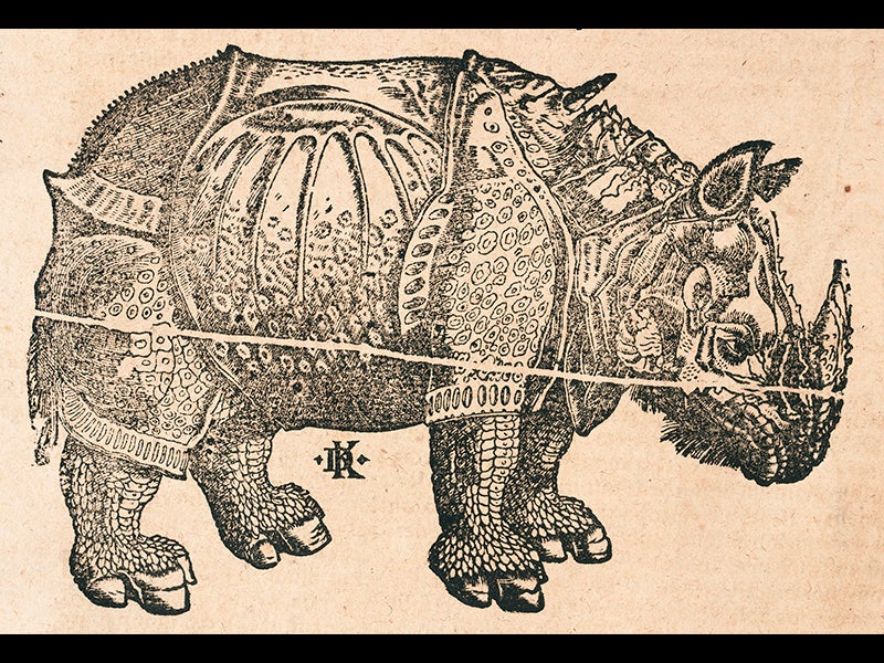 Our copy has hundreds of woodcuts: country maps, city views, portraits of historical figures, battle scenes, and exotic animals. The images above offer a selection, including a map of the New World, a view of Rome, a portrait of Erasmus, a scene of a dowser looking for metals, and a rhinoceros. You may recognize the rhino as a copy of a famous woodcut by Albrecht Dürer (1515). In early editions of the Cosmographia, the rhinoceros woodblock was intact, but somewhere along the line it developed a major crack. This was often the fate of woodblocks used again and again for works issued in multiple editions.