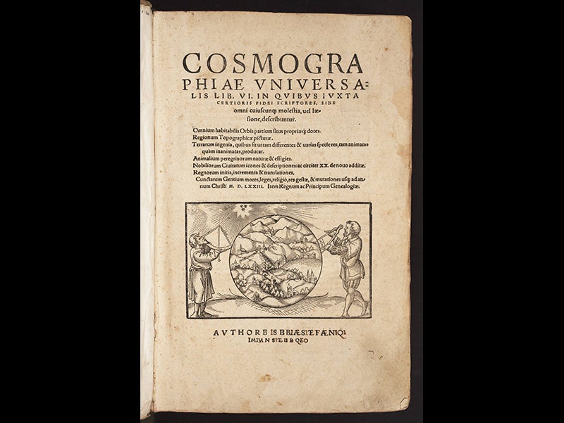 Sebastian Münster, a German scholar, was born Jan. 20, 1488. In 1544, Münster published the first edition of one of the most popular encyclopedias of the century. He called his book Cosmographia, using a word that meant, at the time, a combination of geography, history, natural history, and cartography. Basically, Münster tried to describe every place and neary every thing in the world, for the benefit of readers who wanted to know more about the world. The book was published in Basel and was a runaway best-seller, so that it was immediately reprinted and enlarged, and then translated, and by 1628, when it last appeared, it had gone through 35 editions, an astonishing number for a book that was the size of a toaster oven and contained nearly 1500 pages in most printings. We have a 1572 Latin edition in the History of Science Collection, and it is a monster to behold and an experience to peruse. The index alone is bigger than most stand-alone books--176 folio pages. When you consider that the first edition had no index at all, it is clear that the book evolved dramatically in its first 28 years.