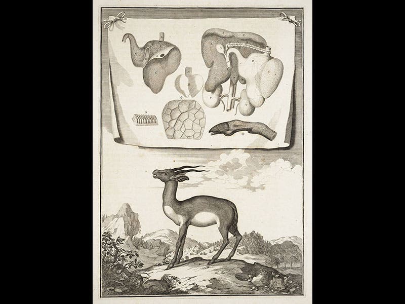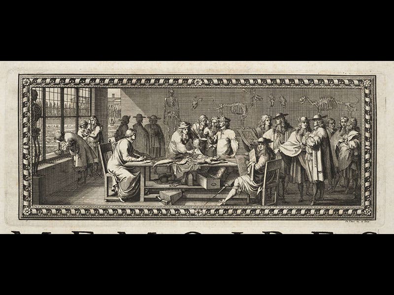 Sébastien Le Clerc, a French artist and engraver, was born Sep. 26, 1637. When Louis XIV established the Académie Royale des Sciences in Paris in 1666, Le Clerc was at the same time appointed engraver to the king, and thus he fell into the position of illustrating the work of the Academy in its scientific publications. When Claude Perrault embarked on the ambitious program of dissecting and analyzing the exotic animals in the King’s menagerie, it was Le Clerc who did all the drawings and engravings for the published work. We see above the external appearance and internal workings of a gazelle (second image) and a tortoise (third image). Le Clerc also designed the headpieces, tailpieces, and decorated initials for the book, Mémoires pour servir a l’histoire naturelle des animaux (1676). One of the headpieces shows Perrault, the anatomists, and Le Clerc, hard at work (fourth image). We acquired this book in 1996 as our so-called “millionth volume,” in celebration of the Library’s fiftieth anniversary. We also displayed it in our 2009 exhibition, The Grandeur of Life, open to Le Clerc’s engraving of the chameleon (and we added the porcupine image for the web exhibition).