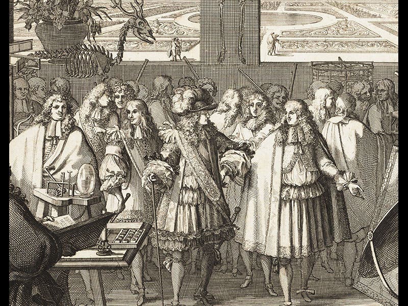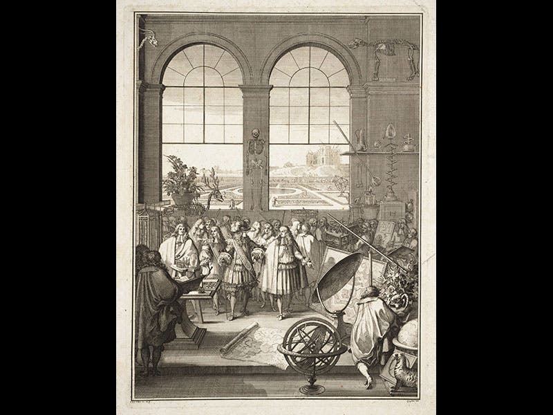 One of Le Clerc’s most famous engravings, which appears as a frontispiece in the Memoires, shows King Louis XIV visiting the Academy, an event that had not yet occurred when Le Clerc conceived the scene in 1671 (fifth image). The detail (first image) shows Louis (with the hat), and some of the Academicians contemplating the newly invented air pump. The Library owns a large bronze wall panel based on this engraving, commissioned when the Library annex was built in 1967. It was originally installed on an outside wall of the annex, but had to be moved inside to the auditorium when another addition was constructed (sixth image).