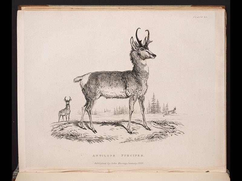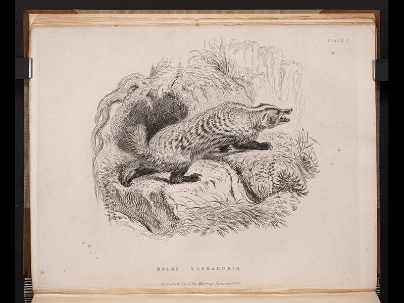 John Richardson, later Sir John, a British surgeon in the Royal Navy, was born Nov. 5, 1787. From 1819 to 1822, and again from 1825 to 1827, Richardson accompanied John Franklin on his attempts to discover a Northwest Passage by travelling overland through what is now Canada to the Arctic sea. The two men and their companions traveled about 8000 miles on the two expeditions, through what was then unexplored territory for Europeans. Richardson was the naturalist on both expeditions, and after the second journey, he compiled a multi-volume Fauna Boreali-Americana, with beautiful illustrations of the animals and birds of the Arctic. Three of the etchings from this work can be seen above: an arctic fox, a pronghorn, and a badger, and two more were included in our 2008 exhibition, Ice: A Victorian Romance.