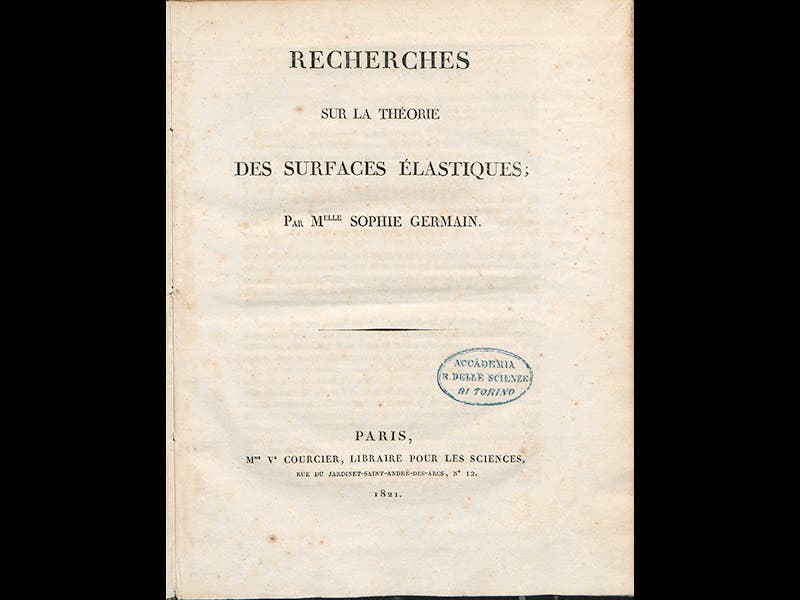 Marie-Sophie Germain, a French mathematician, was born Apr. 1, 1776. At a time when women were not allowed access to universities and professional academies, Sophie taught herself mathematics in her father's library and thus rode out the French revolution. She later began corresponding with the leading mathematicians of her day, such as Joseph Lagrange and Carl Gauss, using the neutral nom de plume of M. LeBlanc, and both Lagrange and Gauss recognized LeBlanc's genius, and were quite surprised (and, I am happy to say, delighted) when her gender was finally revealed. Germain is best known for her work on Fermat's Last Theorem, and for developing a mathematical theory of elasticity. The work on elasticity was submitted as an entry in a contest sponsored by the Paris Academy of Sciences, and in 1816, she was awarded the prize, the first woman ever to win such an award. The work was published in 1821 (second image).