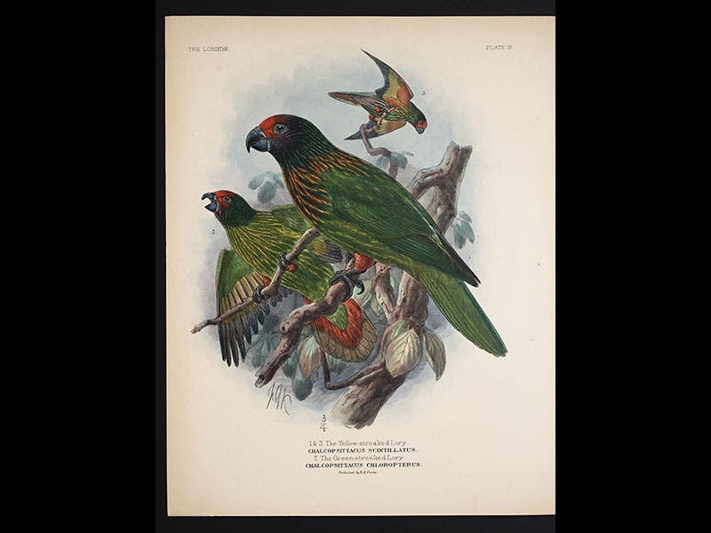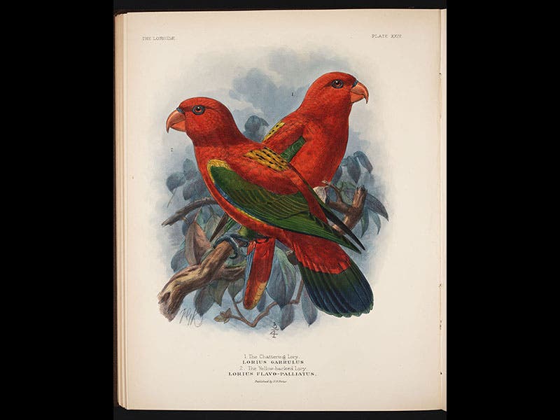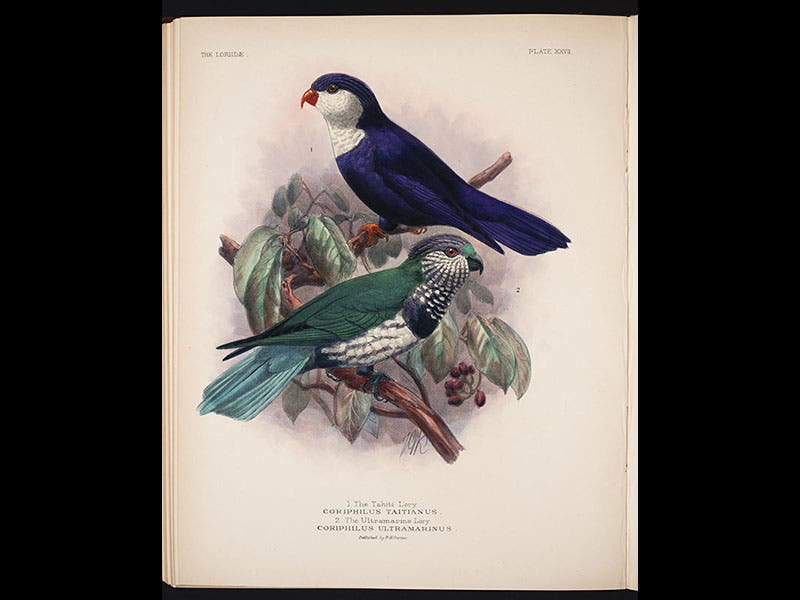 In 1896, Mivart published Monograph on the Loridae; lories or lorikeets are parrot-like birds that live in Indonesia, Australia, New Guinea, and Polynesia. We see here plates of the green-streaked lory (fourth image), the chattering lory (fifth image), and the Tahitian lory with the ultramarine lorikeet (sixth image).