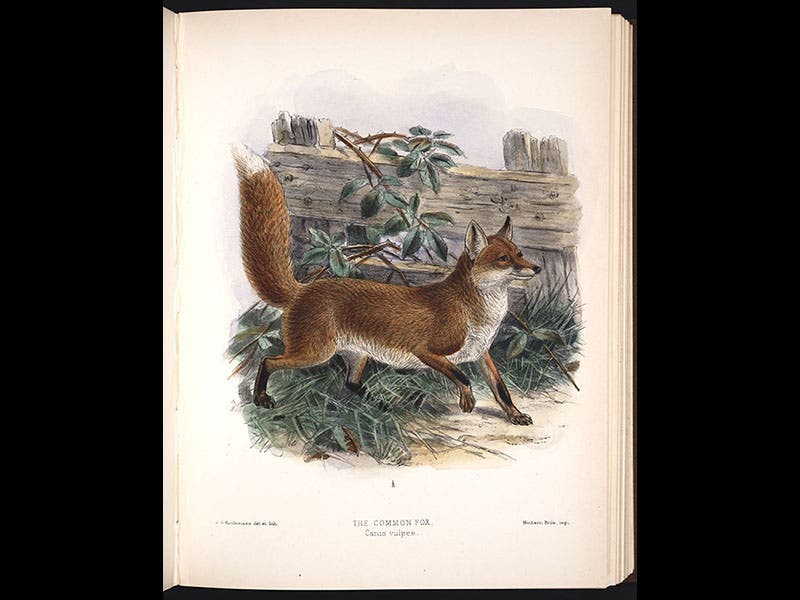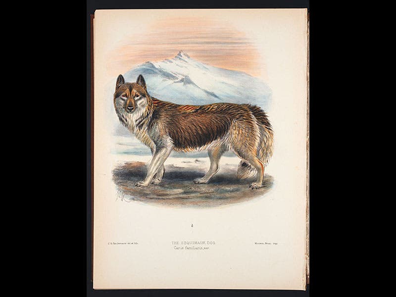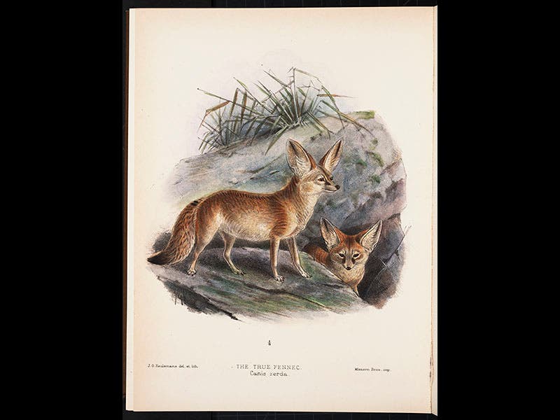 St. George Mivart (yes, St. George was his first name), an English naturalist, was born Nov. 30, 1827. Mivart was an outspoken critic of Darwin’s evolution by natural selection, and he was also critical, as a Catholic, of certain doctrines of the Catholic Church. But as a natural historian, he was less radical, and he published several books on particular families of animals and birds, for which he had the good sense or good fortune to team up with the Dutch illustrator, Johann Gerrard Keulemans, who was not only a painter but a lithographer as well. Dogs, Jackals, Wolves, and Foxes: A Monograph of the Canidae, was published in 1890, with 45 plates of canine carnivores, some of them forbidding, like the Esquimaux dog (see second image above), others just cute, like the African fennec (first image) and the fox (third image).