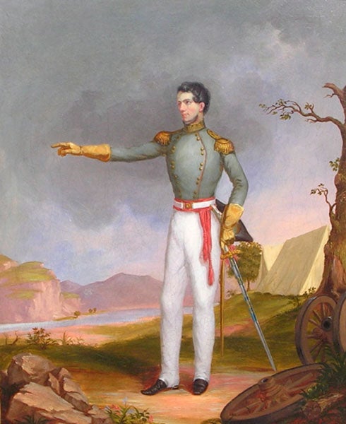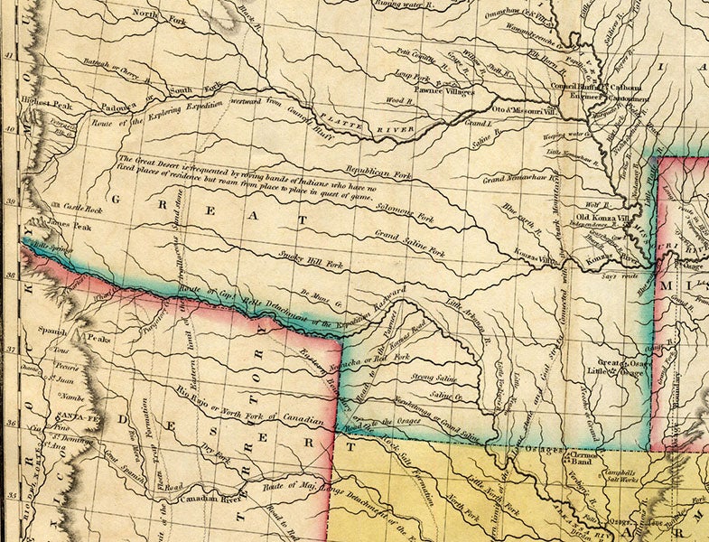 Since Long immediately left on another expedition, the official Narrative was written and published by James in 1823; we have this work in our History of Science Collection, but it is missing the map, so we show you the map from another copy (second image). The map was later printed separately, and we also show a detail from that publication, where you can see the track of the expedition and the phrase “Great American dessert (fourth image). The first image above is a colored engraving by Seymour of the South Platte and the foothills of the Rockies, and the portrait of Long was painted by Titian Peale (second image). We featured Edwin James as the Scientist of the Day on Oct. 28, 2014.