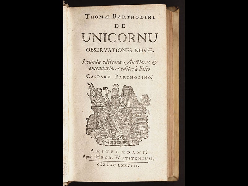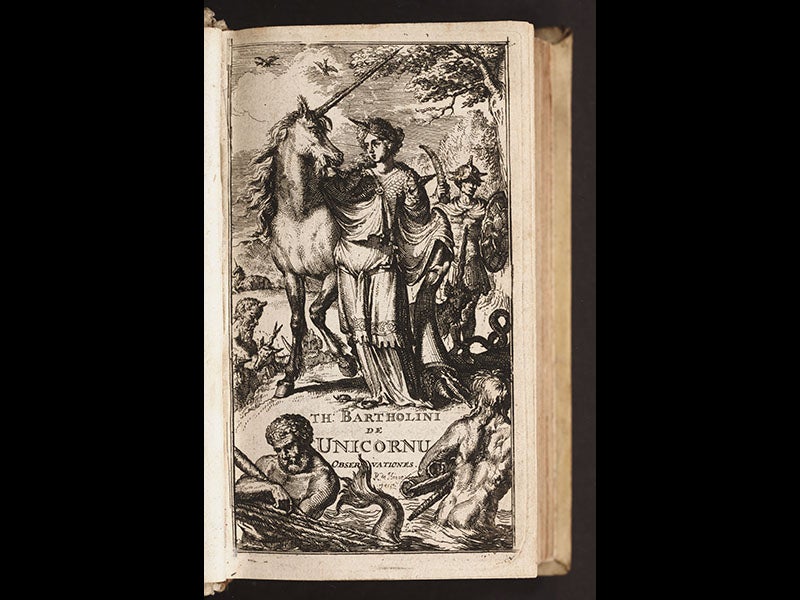 Thomas Bartholin, a Danish physician and naturalist, was born Oct. 20, 1616. Thomas was part of a distinguished family of physicians, including Caspar senior (Thomas's father), and Caspar and Thomas junior (Thomas's sons). Thomas is best known for being the first to write a description of the lymphatic system, but today we feature a rather different kind of book that Thomas first published in 1645, and then reissued, greatly enlarged with the help of his son Caspar, in 1678. The second edition, which we have in our collections, was called De unicornu observationes novae--New Observations about the Unicorn. The book takes a thorough look at all manner of horned animals, indeed at horns of any kind, with a focus on the fabled unicorn. Bartholin is not the first to argue that the unicorn horns that adorned many collections of curiosities were in fact the tusks of Arctic whales called narwhals, but it was his argument, and his picture (second image) that effectively brought the unicorn legend to an end.