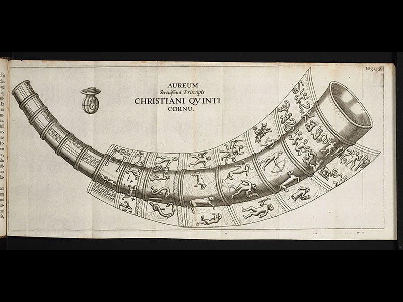 Thomas included a discussion of the rhinoceros, accounts of which might have contributed to the unicorn legend, and this gave him an opportunity to reproduce Albrecht Dürer’s well-known woodcut of the Indian rhinoceros—still reigning supreme in zoological literature even after 160 years (first image). Bartholin also provided the reader with a large fold-out engraving of the Horn of Gallehus, a fifth-century artifact crafted of pure gold that had been found in Denmark in 1639 (third image). We are fortunate to have this visual record, since the horn (and a second found in 1734 at the same location) exist no more, having been stolen from the Copenhagen Kunstkammer in 1802 and melted down.