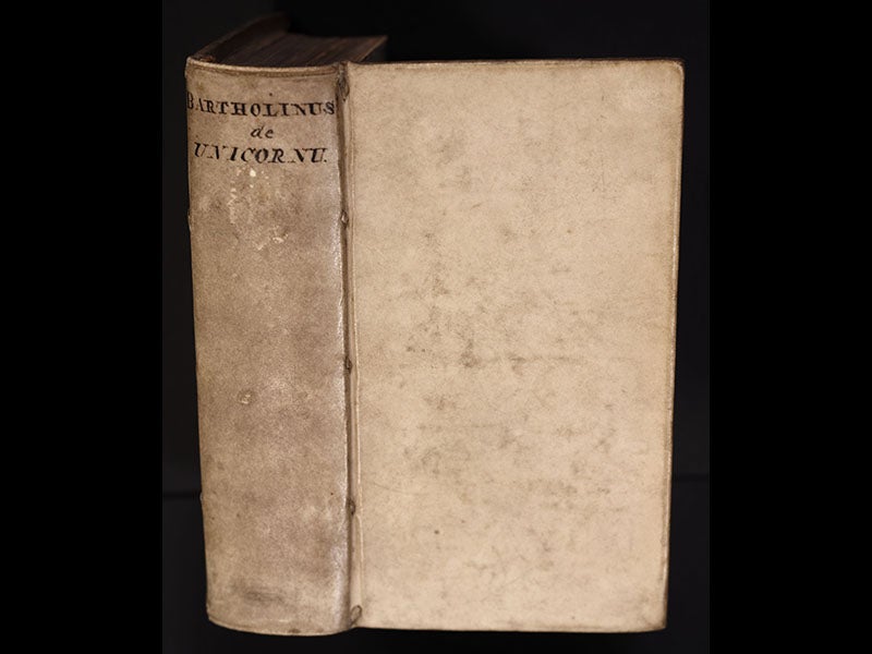 De unicornu begins with a rich allegorical frontispiece, executed by the noted Dutch engraver, Romeyn de Hooghe (fourth image). Our copy of the book happens to be a good-looking duodecimo, bound in vellum, so we decided to include a photograph of the outside of the volume as well (sixth image).
