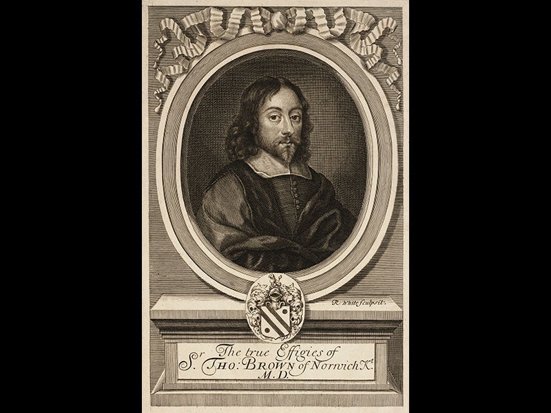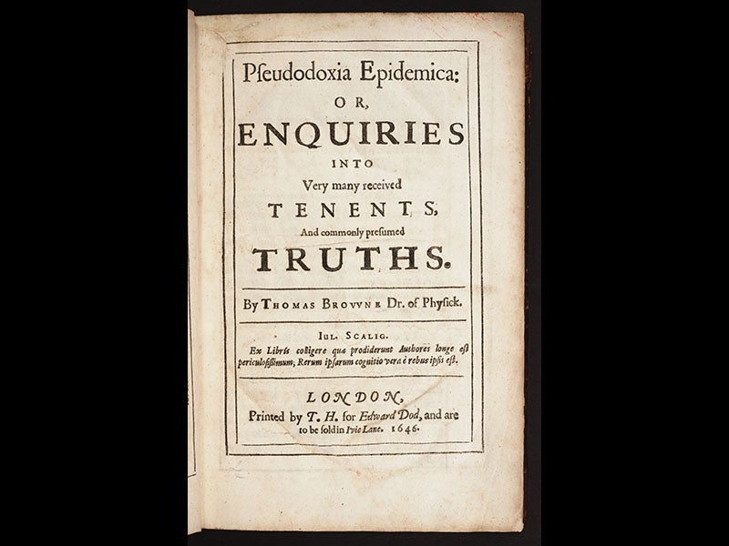 Thomas Browne, an English physician and writer, was born Oct. 19, 1605. Browne was one of the truly great stylists of the British Baroque period, best known perhaps for his Religio medici, a soulful introspective look at religion and mortality. But Browne was also an astute observer of nature, and his Pseudodoxia epidemica (1646) is a truly remarkable work in which Browne assembled all the stories about animals, plants, minerals, the weather, that one could find in the typical work of natural history, and proceeded to test them to see if they are true. Will a kingfisher hung by its bill really point north, as everyone says? Browne hung one up, and found that it points any which way. Does a chameleon live on air? Browne observed one, and discovered that it eats flies (third image). For 2000 years, naturalists had collected such stories and delighted in them, and now someone wanted to know which ones, if any, are true. It is a remarkable moment in natural history, and the discipline was drastically altered because of it. We have a first edition of Browne's Pseudodoxia in the History of Science Collection.