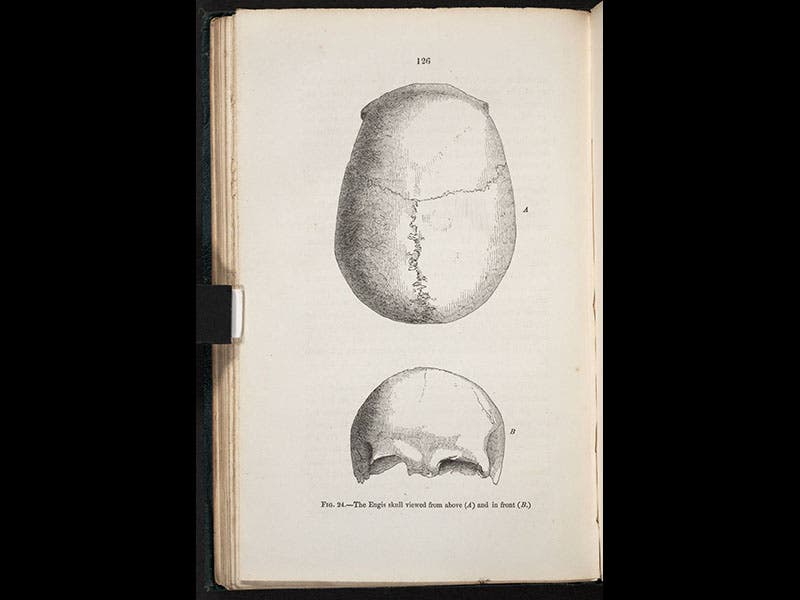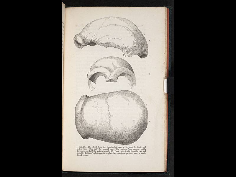 The book is also novel in introducing Huxley’s readership to several human fossils that provided evidence not only for human antiquity, but also, to Huxley’s mind, human evolution. There is a drawing of the first Neanderthal skull, found just 7 years earlier in Germany (third image), and one of the Engis skull, an Upper Paleolithic specimen found in 1830 (fourth image). Huxley was thus the first to advance the idea of human evolution and amass evidence in its favor, 8 years before Darwin would do so himself in The Descent of Man (1871). We displayed Man’s Place in Nature, opened to the frontispiece, in our 2012 exhibition, Blade and Bone: The Discovery of Human Antiquity.