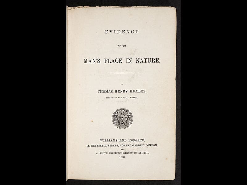 Thomas Henry Huxley, a British comparative anatomist, was born May 4, 1825. Huxley was an instant convert to Darwinian evolution after reading On the Origin of Species in 1859, and he became Darwin’s most important public defender. Moreover, he took evolutionary theory one step further. Darwin did not discuss humans and their origins in his book. In 1863, Huxley published Man's Place in Nature, which made no bones about human evolution (first image above). The book is shocking from its opening frontispiece, drawn especially for this book by Benjamin Waterhouse Hawkins (second image). Or it would be shocking, if you hadn't seen it a thousand times on book jackets and T-shirts and bottles of barbecue sauce. It is hard to imagine looking at it for the very first time, as would be the case if you lived in London in 1863 and had just purchased this book from your local shop or borrowed it from Mudie’s Lending Library. We see a gibbon (twice the size of the rest, for some reason), an orangutan, a chimpanzee, a gorilla, and a human, marching in step toward the future like one big happy family, which was exactly the point Huxley was trying to make—humans and apes are anatomically part of the same family.
