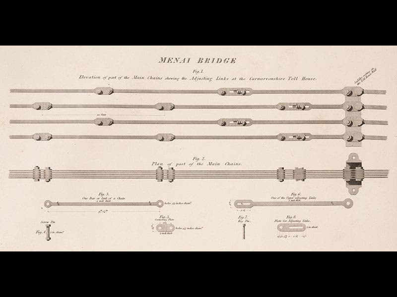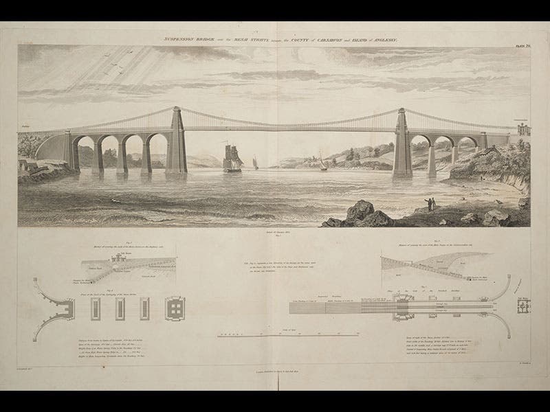Thomas Telford, a British civil engineer, was born Aug. 9, 1757. He came of age in the heyday of canal building in England, and he worked on many of the great canals, but Telford’s greatest contribution to structural engineering was introducing the suspension bridge to Great Britain, in the most dramatic way. In the early nineteenth century, the shortest route from London to Dublin was by road to Holyhead, Anglesey, at the western tip of Wales, and then by ship to Ireland. The problem was that Anglesey is an island, separated from mainland Wales by the Menai Strait, a body of water almost 1500 feet across. Telford designed a suspension bridge that utilized 16 chains, strung between stone towers, from which the roadway was suspended. The chains were made of flat wrought-iron eye-bar links, forged under Telford’s supervision at a Shropshire iron works (very near the Shrewsbury school where young Charles Darwin was at the time discovering he hated Greek). The towers were begun in 1819, the first cable was lifted into position in 1825, and the bridge opened for traffic on Jan. 30, 1826.
