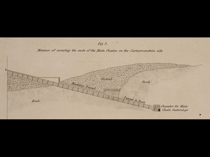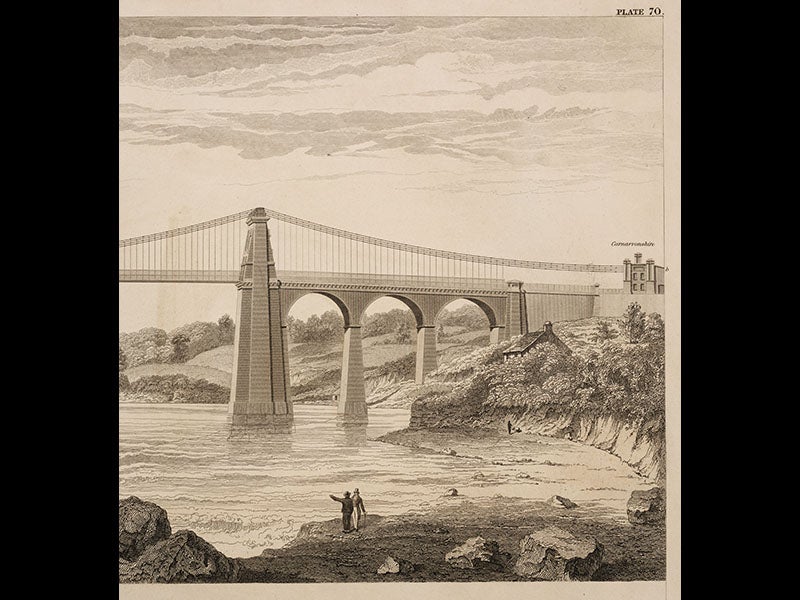 Thomas Telford, a British civil engineer, was born Aug. 9, 1757. He came of age in the heyday of canal building in England, and he worked on many of the great canals, but Telford’s greatest contribution to structural engineering was introducing the suspension bridge to Great Britain, in the most dramatic way. In the early nineteenth century, the shortest route from London to Dublin was by road to Holyhead, Anglesey, at the western tip of Wales, and then by ship to Ireland. The problem was that Anglesey is an island, separated from mainland Wales by the Menai Strait, a body of water almost 1500 feet across. Telford designed a suspension bridge that utilized 16 chains, strung between stone towers, from which the roadway was suspended. The chains were made of flat wrought-iron eye-bar links, forged under Telford’s supervision at a Shropshire iron works (very near the Shrewsbury school where young Charles Darwin was at the time discovering he hated Greek). The towers were begun in 1819, the first cable was lifted into position in 1825, and the bridge opened for traffic on Jan. 30, 1826.
