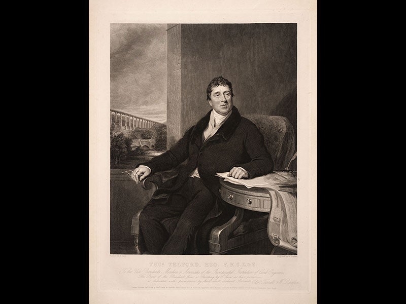 The first five images are from The Life of Thomas Telford, a quarto auto-biography with a massive folio atlas of engraved plates, published in 1838, four years after Telford’s death. We see, in order: the entire bridge; a detail of the span; a further detail showing how the cables were anchored in the ground; and a detail of the structure of the cables. The atlas also has a fine frontispiece engraving of Telford (fifth image).