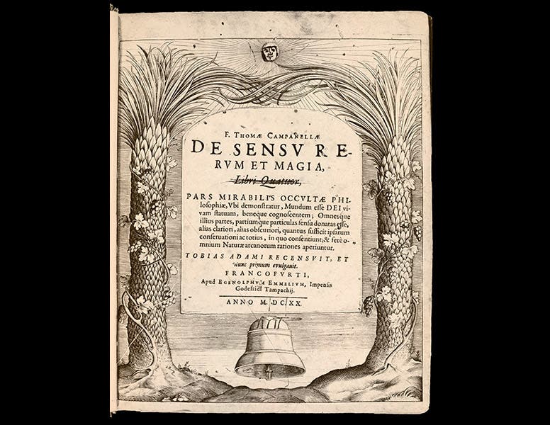 Campanella managed to get a copy of his Apologia to Galileo later in 1616, after Galileo had been reprimanded by the Church, but hardly anyone else saw it, since the book could not be printed in Italy, and it did not see the light of the press until 1622 (third image), when it was published in far-off Frankfurt, where earlier Campanella had published his De sensu rerum et magia (1620; second image). You will notice that both books have the same engraved border.