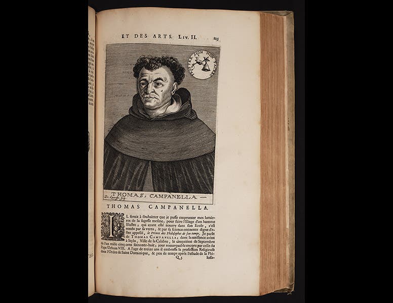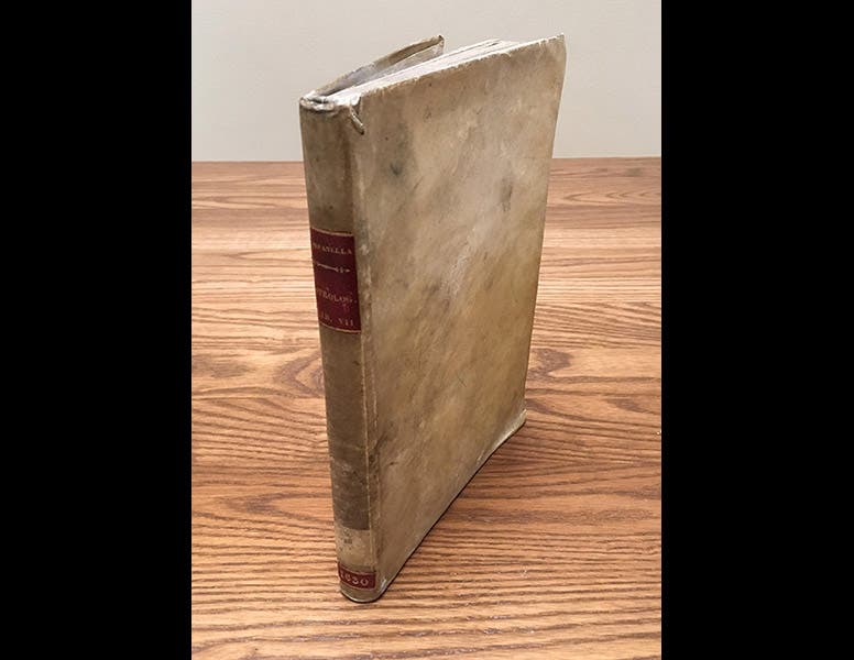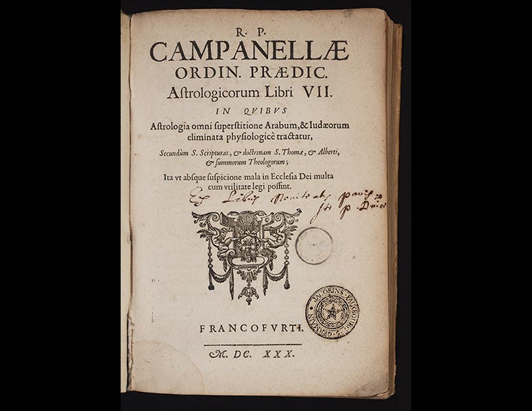 The only Campanella book in our collection is his Astrologicorum (1630), the second edition of a book on astrology, about which Campanella had strong positive feelings (fourth and fifth images).