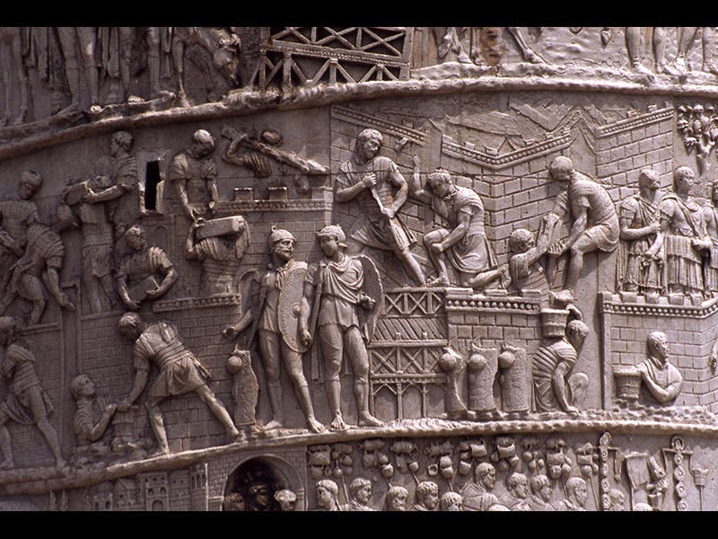 How Apollodorus erected the column is not known. The Romans did have cranes, but it still would have been difficult to raise such heavy drums to such a height with a crane, so they probably used a tower. The real trick would have been installing the capital, which weighed as much as two drums and had to be lifted over 100 feet in the air. If the account of the moving of the Vatican obelisk in 1586 is any indication, installing the capital would have required thousands of men, many miles of rope, lots of horses, capstans and pulleys, and the air would have been colored, shall we say, caerulean, for miles around. But there is no doubt that the Greco-Roman engineer managed to do it, because the column is there for us to behold, just where it has stood for over 1900 years. It is an amazing accomplishment, however you look at it, one of many perpetuated by those technologically-savvy Romans. And that praise does not even take into account the beauty of the frieze. Trajan should have had no complaints about his monument.