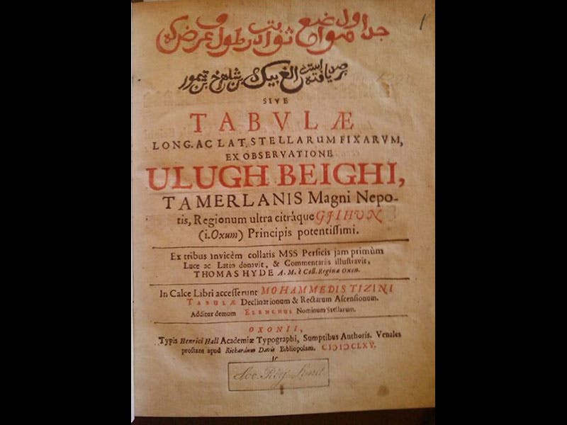 We have a copy of the 1665 Latin edition of Ulugh Beg's star tables and catalog in the History of Science Collection, although the image above is from the copy at the Royal Society of London.