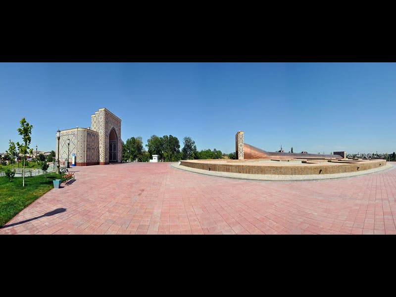 Ulugh Beg, a Mongol ruler and astronomer, died Oct. 27, 1449, at age 55. Ulugh Beg built a research institute (madrasah) and an observatory in Samarkand, in what is now Uzbekistan. The observatory, which was completed about 1429, had several massive instruments, including a quadrant dug into the side of a hill with a radius of about 150 feet, and an underground sextant that was almost as large (see second image above). With these instruments, and presumably others, Ulugh Beg made a catalog of the stars--the first new catalog since the one published in Ptolemy's Almagest in the 2nd century AD. Unfortunately, Ulugh Beg was assassinated by his own son in 1449, and the observatory was destroyed. His catalog, written in Arabic, disappeared, and was only rediscovered in the West in 1665, when it was published in England in a Latin translation (third image). The observatory was rediscovered in the early 20th century and has now been refurbished; it is quite a sight, even in ruins (first image). In this panorama, we see the remains of an observatory building at left and the underground sextant extending off toward the right.