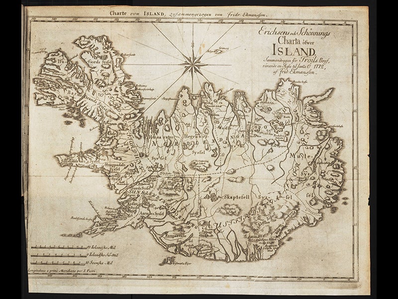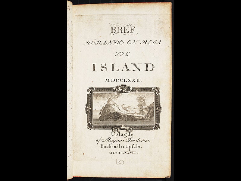 Uno von Troil, a Swedish naturalist and explorer, was born Feb. 24, 1746, in Stockholm. In 1772, von Troil embarked on a scientific voyage to Iceland, and one of his companions was Joseph Banks (whose birthday we celebrated on Feb. 13). Banks had been planning to go on Captain Cook's second voyage, but the two had a disagreement, and Banks decided to go to Iceland with von Troil instead. On the way, Banks and von Troil stopped at the island of Staffa, in the Scottish Hebrides, and became the first English (and Swedish) visitors to see Fingal's Cave (see the images posted on Feb. 13). In Iceland, they observed the active volcano Mt. Hekla, and the famous Geyser, which soon gave its name to all other geysers worldwide. We have two editions of von Troil's published account of his Iceland adventures in the History of Science Collection, the original Swedish version (1777), from which the images above were taken, and an English translation (1780) that omits all but two of the engravings. Von Troil later became Archbishop of Uppsala, which makes von Troil one of only two Archbishops who, to my knowledge, made important contributions to science, the other being Nicolaus Steno, the geologist.
