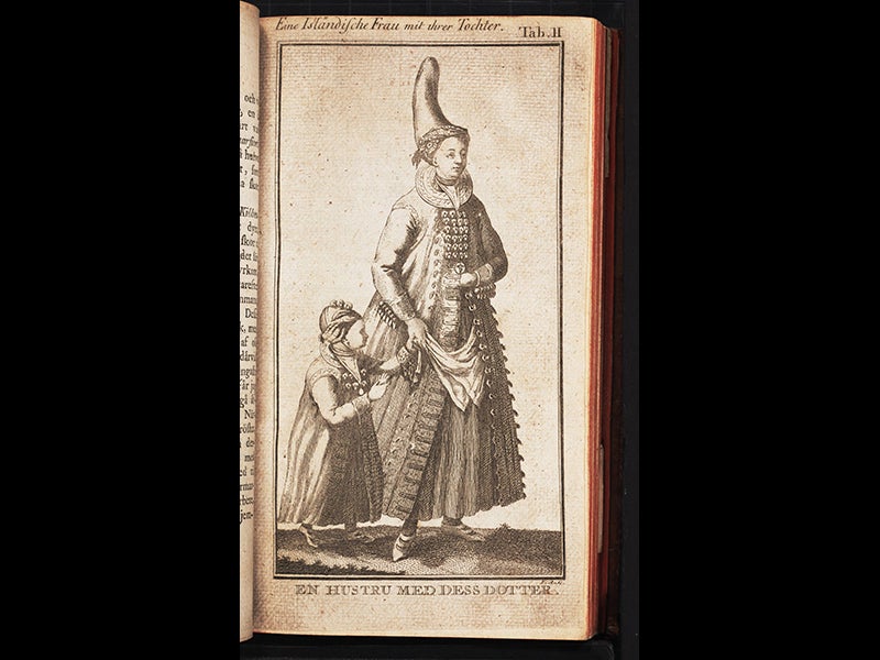 The images show, in order: Geyser; the title page of the 1777 book, with a tiny vignette of Mt. Hekla; a detail of the vignette, which also shows Geyser at the right (it is not really that close to the volcano); a folding map of Iceland, and a drawing of an Icelandic “Frau” with her daughter.