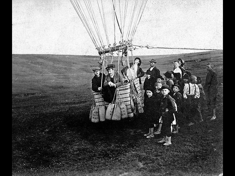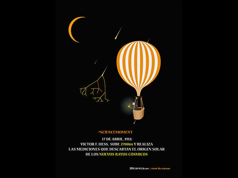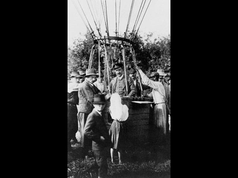One of Hess’s flights occurred on Aug. 7, 1912, when he rose to an altitude of over 17,000 feet and brought back conclusive evidence of the extraterrestrial origin of cosmic radiation; we have photographs that document the landing of this flight (second image) and another unspecified flight (third image). On April 17, 1912, there was an eclipse of the Sun, and Hess supposedly flew that day as well. We have no photographic record, but a modern blogger has created a beautiful poster commemorating the day, with eclipsed sun, Victor, balloon, and cosmic rays in colorful evidence (first image).