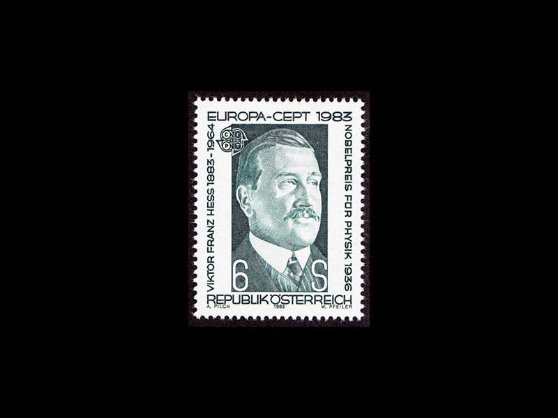 Victor Franz Hess, an Austrian physicist, was born June 24, 1883. In 1911-12, Hess was studying ionization in the atmosphere. Most scientists thought that electrically charged particles in the atmosphere were ionized by radiation from the earth, and that therefore the higher up you went, the less electrical activity you would find. Hess launched high-altitude balloons with detection equipment, and found that radiation decreased up to a certain height, and then the ionization began to increase to a surprising extent. When others suspected that his instruments were malfunctioning, Hess launched himself in balloons along with his equipment, to altitudes of several miles. His instruments had not lied; some kind of radiation was coming in from outer space to ionize the air. In 1925, Robert Millikan called these "cosmic rays". In 1936, Hess received the Nobel Prize in Physics for his discovery of cosmic rays. Shortly thereafter, with the rise of Nazism in Europe, Hess came to the United States, and he ended his career at Fordham University in New York City, studying the medical effects of radium and radon gas. On the centennial of his birth, Austria issued a commemorative postage stamp in Hess’s honor (fourth image).