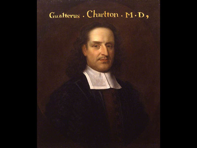 We have four Charleton works in our History of Science Collection, including the two discussed above. His portrait (fifth image) is in the collection of the Royal College of Physicians in London.
