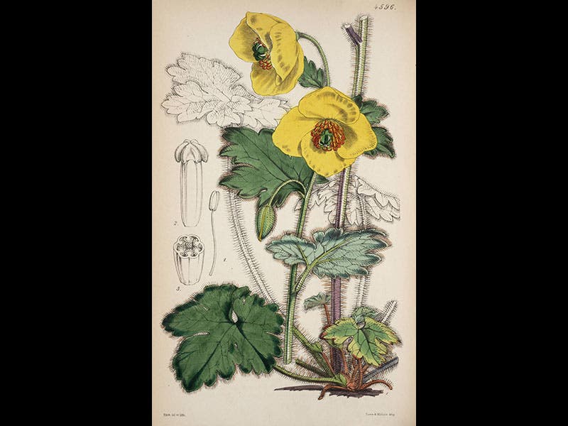 Walter Hood Fitch, a Scottish botanical artist and illustrator, was born Feb. 28, 1817. While still quite young, Fitch came to the attention of William J. Hooker, who was professor of botany in Glasgow and had inherited the editorship of Curtis' Botanical Magazine (CBM). Hooker invited Fitch to contribute some illustrations for the magazine and Fitch did so; his first watercolors, converted to lithographs, were published in 1834, when he was just 17 years old. Fitch continued to collaborate with Hooker for the next forty years. When Hooker was appointed Director of Kew Gardens in 1841 and moved to London, Fitch went with him. Several of Fitch's illustrations for CBM are shown above: a Nepalese poppy (first image), a gentian (second image), a saxifrage (third image), and a barbery from Chile (fourth image). The last is of interest because it was introduced to Kew Gardens by Charles Darwin, who brought back specimens from South America. Two more of Fitch’s illustrations for Curtis’ Botanical Magazine were displayed in our 2009 exhibition, The Grandeur of Life.