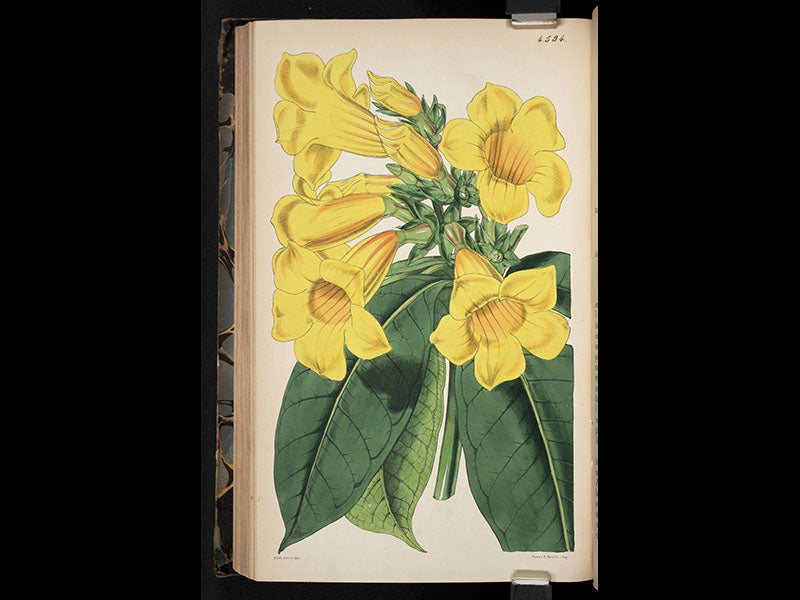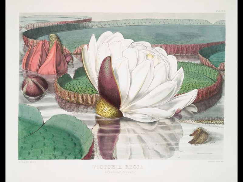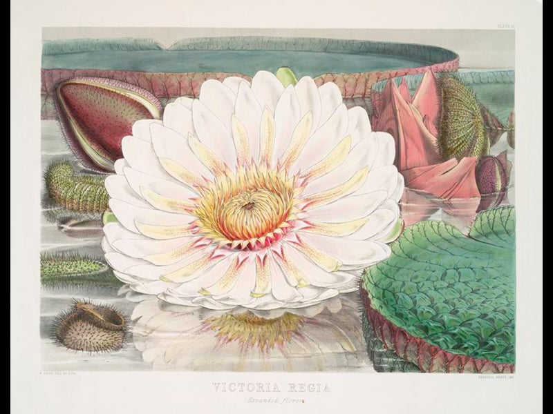 Fitch also illustrated a number of monographs, such as an 1851 publication by Hooker on the Victoria regia, the giant Amazonian water lily that proved to be quite a sensation in Victorian England. We do not own this work; the illustrations above (fifth and sixth images) are from the copy at the New York Public Library.